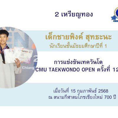 ขอชื่นชมและร่วมแสดงความยินดีกับ เด็กชายพิงค์ สุทธะนะ นักเรียนชั้นมัธยมศึกษาปีที่ 1 ได้รับ รางวัล 2 เหรียญทอง (เหรียญทอง ประเภทต่อสู้ (Kyorugi) รุ่นอายุ 13-14 ปี(ชาย) น้ำหนัก 43-47 กิโลกรัม และ เหรียญทอง ประเภทต่อสู้ (Kyorugi) รุ่นอายุ 15-17 ปี (ชาย) น้ำหนัก 45-48 กิโลกรัม) ในการแข่งขันเทควันโด รายการ CMU Taekwondo Open ครั้งที่ 12 เมื่อวันที่ 15 กุมภาพันธ์ 2568 ณ สนามกีฬาสมโภชเชียงใหม่ 700 ปี จังหวัดเชียงใหม่ จัดโดย มหาวิทยาลัยเชียงใหม่