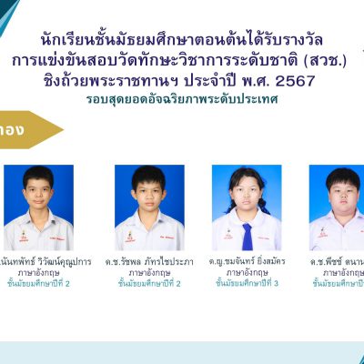 ขอชื่นชมและร่วมแสดงความยินดีกับ นักเรียนชั้นมัธยมศึกษาตอนต้น ได้รับรางวัลการแข่งขันสอบวัดทักษะวิชาการระดับชาติ (สวช.) ชิงถ้วยพระราชทาน สมเด็จพระกนิษฐาธิราชเจ้า กรมสมเด็จพระเทพรัตนราชสุดาฯ สยามบรมราชกุมารี ประจำปี พ.ศ. 2567 (รอบสุดยอดอัจฉริยภาพระดับประเทศ) เมื่อวันที่ 18 มกราคม 2568