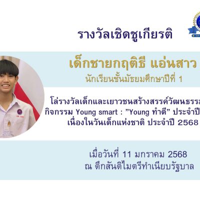ขอชื่นชมและร่วมแสดงความยินดีกับ เด็กชายกฤติธี แอ่นสาว นักเรียนชั้นมัธยมศึกษาปีที่ 1 ได้รับโล่รางวัลเชิดชูเกียรติ เด็กและเยาวชนสร้างสรรค์วัฒนธรรมไทย กิจกรรม Young smart : ”Young ทำดี“ ประจำปี 2567 จาก นางสาวสุดาวรรณ หวังศุภกิจโกศล รัฐมนตรีว่าการกระทรวงวัฒนธรรม ณ ตึกสันติไมตรีทำเนียบรัฐบาล เมื่อวันที่ 11 มกราคม 2568