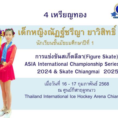 ขอชื่นชมและร่วมแสดงความยินดีกับ เด็กหญิงณัฏฐ์ชรีญา ยาวิสิทธิ์ นักเรียนชั้นมัธยมศึกษาปีที่ 1 ร่วมแสดงโชว์หน้าพระที่นั่งสมเด็จพระนางเจ้าพระบรมราชินี ในพิธีพระราชทานรางวัลการแข่งขันสเก็ตลีลาเชียงใหม่ชิงชนะเลิศแห่งเอเชียประจำปี 2568 ได้รับรางวัลชนะเลิศ 4 เหรียญทอง การแข่งขันสเก็ตลีลา(Figure Skate) รายการ ASIA International Championship Series Final 2024 & Skate Chiangmai 2025 ประเภท Theater Production, Solo Freestyle 4, Couple Spotlight Character ระหว่างวันที่ 16 – 17 กุมภาพันธ์ 2568 และถ้วยรางวัลชนะเลิศ ประเภททีมรวมคะแนนสูงสุดจากสมเด็จพระนางเจ้าพระบรมราชินี ณ ศูนย์กีฬาฤดูหนาว Thailand International Ice Hockey Arena Chiangmai