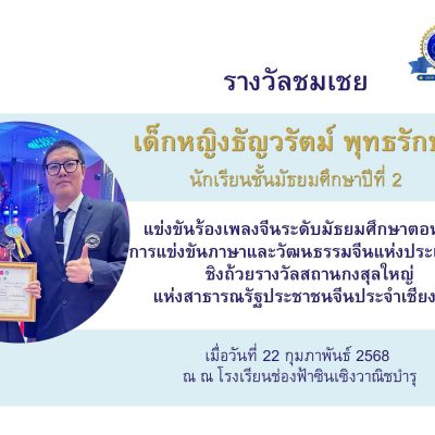 ขอชื่นชมและร่วมแสดงความยินดีกับ เด็กหญิงธัญวรัตม์ พุทธรักษา นักเรียนชั้นมัธยมศึกษาปีที่ 2 ได้รับรางวัลชมเชย ในการแข่งขันร้องเพลงจีน ระดับมัธยมศึกษาตอนต้น จากการแข่งขันภาษาและวัฒนธรรมจีนแห่งประเทศไทย ชิงถ้วยรางวัลสถานกงสุลใหญ่แห่งสาธารณรัฐประชาชนจีนประจำเชียงใหม่ หรือที่เรียกว่า “จงหลิ่งเปย” ครั้งที่ 5 เพื่อเป็นเวทีสำหรับนักเรียนที่เรียนภาษาจีนในประเทศไทยได้แสดงความสามารถทางภาษาจีนและเปิดโอกาสให้มีการแลกเปลี่ยนเรียนรู้ระหว่างโรงเรียนและเขตพื้นที่การศึกษาต่าง ๆ ทั่วประเทศ โดยในปีการศึกษา 2567 มีนักเรียนจาก 252 โรงเรียนใน 69 จังหวัด รวมทั้งสิ้น 534 คนเข้าร่วมการแข่งขัน จัดขึ้น ณ โรงเรียนช่องฟ้าซินเซิงวาณิชบำรุง เมื่อวันที่ 22 กุมภาพันธ์ 2568