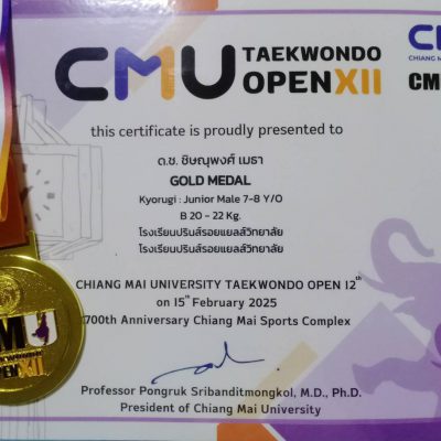 ขอชื่นชมและร่วมแสดงความยินดีกับ เด็กชายชิษณุพงศ์ เมธา ชั้นประถมศึกษาปีที่ 2/13 ได้รับรางวัลเหรียญทอง 1 เหรียญ การแข่งขันเทควันโด ประเภทต่อสู้ (Kyorugi) ชาย 7-8 ปี น้ำหนัก 21 กก. รายการที่ไปแข่ง CMU Taekwondo Open ครั้งที่ 12 จัดโดย ชมรมเทควันโด มหาวิทยาลัยเชียงใหม่ ณ โรงพละ2 สนามกีฬาสมโภชเชียงใหม่700ปีระดับภาคเหนือ เมื่อวันที่ 15 กุมภาพันธ์ 2568