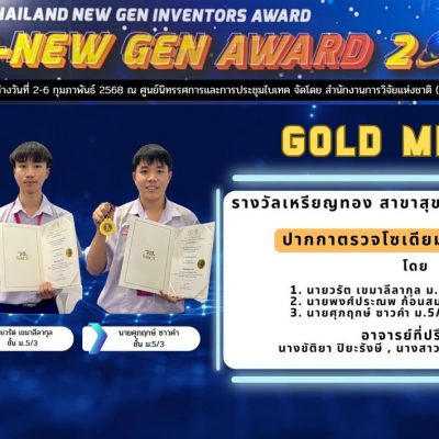 ขอชื่นชมและแสดงความยินดีกับ นักเรียน PRC ที่ได้รับรางวัลเหรียญทอง จากการประกวดสิ่งประดิษฐ์และนวัตกรรม ในงาน “วันนักประดิษฐ์แห่งชาติ ประจำปี 2568” เวที Thailand New Gen Inventors Award : I-New Gen Award 2025 วันที่ 2 – 6 กุมภาพันธ์ 2568 ณ ศูนย์นิทรรศการและการประชุมไบเทค บางนา กรุงเทพมหานคร จัดโดย สำนักงานการวิจัยแห่งชาติ (วช.) กระทรวงการอุดมศึกษา วิทยาศาสตร์ วิจัยและนวัตกรรม (อว.)