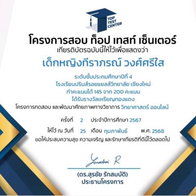เด็กหญิงทีราภรณ์ วงศ์ศรีใส ได้รับรางวัลเหรียญทอง วิชาภาษาอังกฤษ และรางวัลเหรียญทองแดง วิชาวิทยาศาสตร์ โครงการทดสอบและพัฒนาศักยภาพทางวิชาการ อังกฤษ /วิทยาศาสตร์ แบบออนไลน์