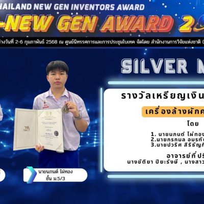 ขอชื่นชมและแสดงความยินดีกับ นักเรียน PRC ที่ได้รับรางวัลเหรียญเงิน จากการประกวดสิ่งประดิษฐ์และนวัตกรรม ในงาน “วันนักประดิษฐ์แห่งชาติ ประจำปี 2568” เวที Thailand New Gen Inventors Award : I-New Gen Award 2025 วันที่ 2 – 6 กุมภาพันธ์ 2568 ณ ศูนย์นิทรรศการและการประชุมไบเทค บางนา กรุงเทพมหานคร จัดโดย สำนักงานการวิจัยแห่งชาติ (วช.) กระทรวงการอุดมศึกษา วิทยาศาสตร์ วิจัยและนวัตกรรม (อว.)