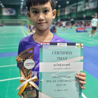 ดศุขอชื่นชมและร่วมแสดงความยินดีกับ เด็กชายศุภวิชญ์ ธนาฤทธิ์ นักเรียนชั้นประถมศึกษาปีที่ 2/11 ได้รับรางวัลรองชนะเริสอันดับที่ 2 ประเภมชายเดี่ยว ราการแข่งแบดมินตันรายการ Happyness Relax chiangmai 2025 #1 แข่งขัน ณ สนามแบดมินตัน CMI เชียงใหม่ เมื่อวันที่ 15 มีนาคม 2568