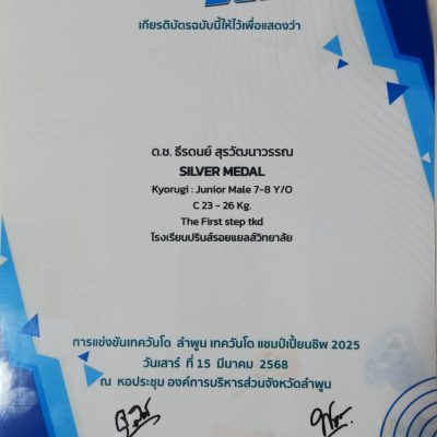 ขอชื่นชมและแสดงความยินดีกับเด็กชายธีรดนย์ สุรวัฒนาวรรณ อนุบาล 3/10 ได้รับรางวัล Silver Medal การแข่งขันเทควันโด ประเภทต่อสู้ KYORUGI : JUNIOR MALE 7 – 8 YEARS OLD | C 23 – 26 KG. จากการแข่งขัน LAMPHUN TAEKWONDO CHAMPIONSHIP 2025 จัดโดย การกีฬาแห่งประเทศไทย จังหวัดลำพูน เมื่อวันที่ 15 มีนาคม 2568 ณ หอประชุมองค์การบริหารส่วนจังหวัดลำพูน