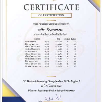 ขอชื่นชมและร่วมแสดงความยินดีกับ เด็กชายเตชิต จินดาหลวง ชั้นประถมศึกษาปีที่ 2/2 ได้รับเหรียญรางวัล 1 เหรียญทอง ผลัดฟรีสไตร์ทชาย 4 x 50 เมตร รายการ การแข่งขันว่ายน้ำชิงชนะเลิศแห่งประเทศไทย ภาค 5 (เหนือ) ประจำปี 2568 GC Thailand Swimming Championships 2025 Region 5 จัดโดย สมาคมกีฬาว่ายน้ำแห่งประเทศไทย ณ สระว่ายน้ำอุบลรัตนราชกัญญา มหาวิทยาลัยแม่โจ้ จังหวัดเชียงใหม่ เมื่อวันที่ 15 – 17 มีนาคม พ.ศ. 2568