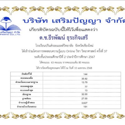 ขอชื่นชมและร่วมแสดงความยินดีกับ เด็กชายธีรพัฒน์ ธุระกิจเสรี ชั้นประถมศึกษาปีที่ 2/6 ได้รางวัลเหรียญทองแดง โครงการทดสอบความรู้แบบออนไลน์ วิชาวิทยาศาสตร์ ครั้งที่ 37 ระดับชั้นประถมศึกษาปีที่ 2 ประจำปีการศึกษา 2567 จัดโดยบริษัท เสริมปัญญา จำกัด เมื่อวันที่ 10 เมษายน 2568