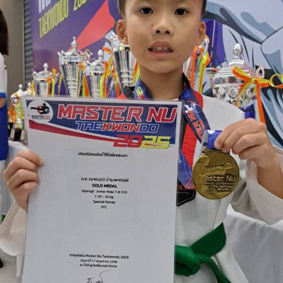 ได้รับรางวัล เหรียญทอง GOLD MEDAL Kyorugi : Junior Male 7-8 Y/O Class B 20-23 Kg. รายการแข่งขัน MASTER NU TAEKWONDO 2025