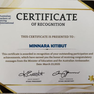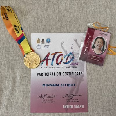 เด็กหญิงมิญณารา กิติบุตร ชั้นประถมศึกษาปีที่ 2/6 ได้รับรางวัล Gold Medal Award จากการแข่งขัน Classical ballet Solo Test 2 ประเภท syllabus ATOD International Dance Competition 2025