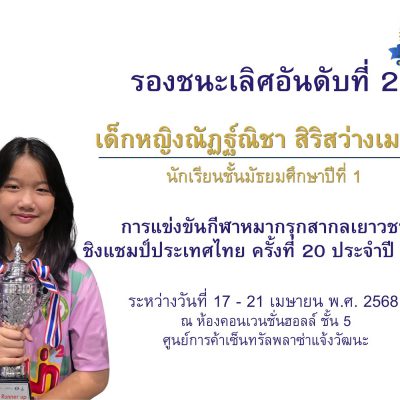 ขอชื่นชมและแสดงความยินดีกับ เด็กหญิงณัฏฐ์ณิชา สิริสว่างเมฆ นักเรียนชั้นมัธยมศึกษาปีที่ 1 ได้รับรางวัลรองชนะเลิศอันดับที่ 2 รุ่นอายุไม่เกิน 14 ปี หญิงจากการแข่งขันกีฬาหมากรุกสากลเยาวชนชิงแชมป์ประเทศไทย ครั้งที่ 20 ประจำปี 2568ระหว่างวันที่ 17 – 21 เมษายน พ.ศ. 2568 ณ ห้องคอนเวนชั่นฮอลล์ ชั้น 5 ศูนย์การค้าเซ็นทรัลพลาซ่าแจ้งวัฒนะ กรุงเทพฯ