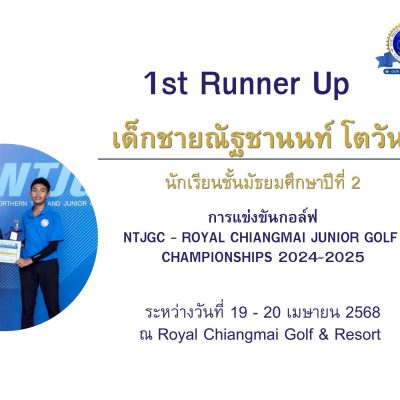 ขอชื่นชมและแสดงความยินดีกับ เด็กชายณัฐชานนท์ โตวัน นักเรียนชั้นมัธยมศึกษาปีที่ 2/2 ที่ได้รับรางวัล 1st Runner Up : Class BOY-B, Division II จากรายการแข่งขันกอล์ฟ NTJGC – ROYAL CHIANGMAI JUNIOR GOLF CHAMPIONSHIPS 2024-2025 ณ Royal Chiangmai Golf & Resort ระหว่างวันที่ 19-20 เมษายน 2568 จัดโดย Northern Thailand Junior Golf Club