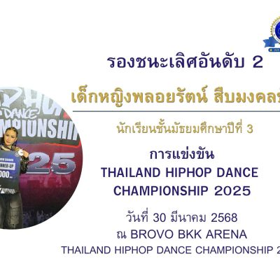 ขอชื่นชมและแสดงความยินดีกับ เด็กหญิงพลอยรัตน์ สืบมงคลชัย ชั้นมัธยมศึกษาปีที่ 3/8 ที่ได้รับรางวัล2ND RUNNER-UP รุ่น JV MEGACREW DIVISION (รองชนะเลิศอันดับ 2) จากรายการแข่งขัน THAILAND HIPHOP DANCE CHAMPIONSHIP 2025 ณ  BROVO BKK ARENA (บราโว่ บีเคเค อารีน่า) เมื่อวันที่ 30 มีนาคม 2568 จัดโดย THAILAND HIPHOP DANCE CHAMPIONSHIP 2025 (HHI THAILAND)