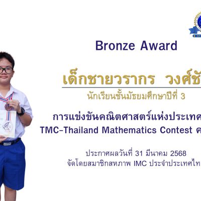 ขอชื่นชมและแสดงความยินดีกับ เด็กชายวรากร วงศ์ชัย ชั้นมัธยมศึกษาปีที่ 3/3 ได้รับรางวัลเหรียญทองแดง (Bronze Award) การแข่งขันคณิตศาสตร์แห่งประเทศไทย (TMC-Thailand Mathematics Contest) ครั้งที่13 วันที่สอบ 23 กุมภาพันธ์ 2568 สถานที่สอบ โรงเรียนอนุบาลเชียงใหม่ จังหวัดเชียงใหม่ จัดโดยสมาชิกสหภาพ IMC ประจำประเทศไทย ประกาศผลวันที่ 31 มีนาคม 2568