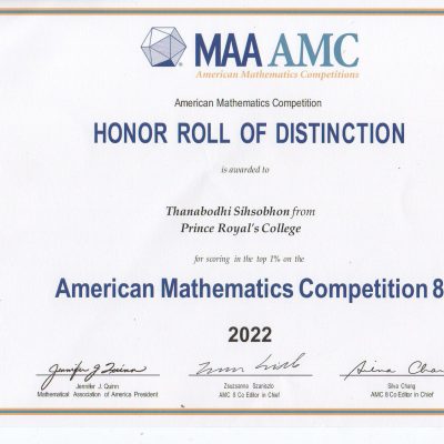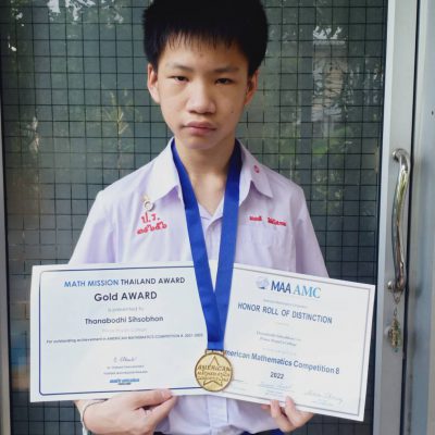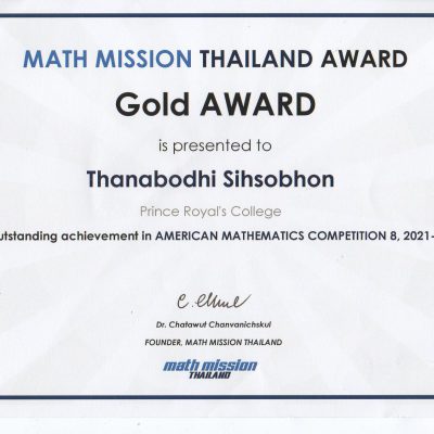 รางวัลที่ได้รับ – Honor Roll of Distinction for Top 1% โดย Mathematical Association of America (MMA) จากผู้เข้าร่วมแข่งขัน 68,820 คนทั่วโลก เหรียญทอง และเกียรติบัตรจาก Math Mission Thailand (ตัวแทนผู้จัดในประเทศไทย)