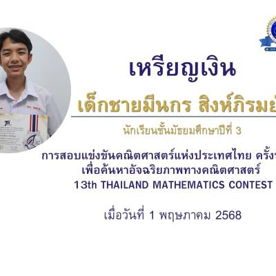 ขอชื่นชมและแสดงความยินดีกับ เด็กชายมีนกร สิงห์ภิรมย์ ชั้นมัธยมศึกษาปีที่ 3/2 ที่ได้รับรางวัลเหรียญเงิน จากการสอบแข่งขันคณิตศาสตร์แห่งประเทศไทย ครั้งที่ 13 เพื่อค้นหาอัจฉริยภาพทางคณิตศาสตร์ 13th THAILAND MATHEMATICS CONTEST จัดโดย สมาชิกภาพ สหภาพ IMC ประจำประเทศไทย INTERNATIONAL MATHEMATICS CONTEST UNION THAILAND SECRETARIAT จัดแข่งขันเมื่อวันที่ 23 กุมภาพันธ์ 2568 ณ.สนามสอบ รร.อนุบาลเชียงใหม่ รับรางวัลเมื่อวันที่ 1 พฤษภาคม 2568