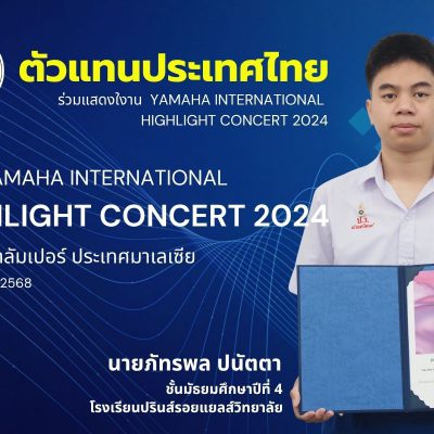 ขอชื่นชมและแสดงความยินดีกับ นายภัทรพล ปนัตตา ม.4/1 ที่ได้รับเลือกให้ตัวแทนประเทศไทย ในนามโรงเรีนดนตรียามาฮ่านครพิงค์ เชียงใหม่ เข้าร่วมแสดงในงาน YAMAHA INTERNATIONAL HIGHLIGHT CONCERT 2024 จัดโดย Yamaha Music ณ Dewan Filharmonik PETRONAS กรุงกัวลาลัมเปอร์ ประเทศมาเลเซีย เมื่อวันที่ 11 มกราคม 2568 (ระดับนานาชาติ)
