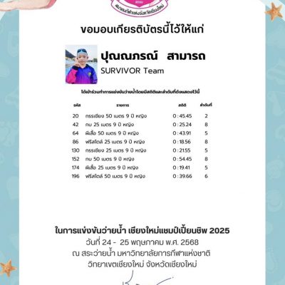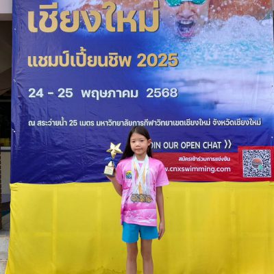 จากการแข่งขันว่ายน้ำเชียงใหม่แชมป์เปี้ยนชิพ 2025 ณ สระว่ายน้ำ 25 เมตร มหาวิทยาลัยการกีฬาแห่งชาติ วิทยาเขตเชียงใหม่ จังหวัดเชียงใหม่