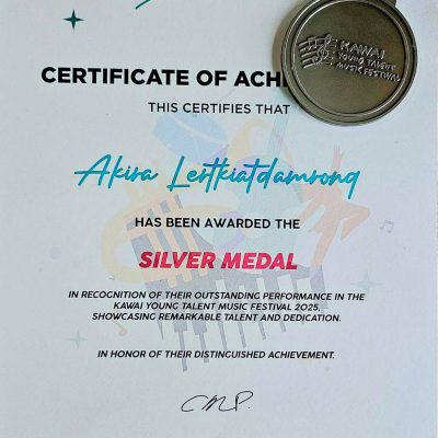 ขอชื่นชมและร่วมแสดงความยินดีกับ เด็กหญิงอคิราภ์ เลิศเกียรติดำรงค์ นักเรียนชั้นประถมศึกษาปีที่ 2/5 ได้รับรางวัล SIVER MEDAL ประเภท Piano Solo การแข่งขันรายการ KAWAI YOUNG TALENT MUSIC FESTIVAL 2025 รูปแบบonline จัดโดย KAWAI MUSIC SCHOOL THAILAND เมื่อวันที่ 30 เมษายน 2568