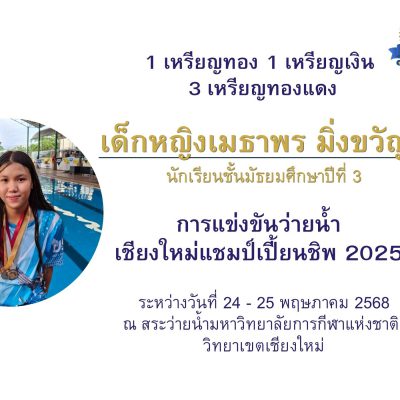 จากการแข่งขันว่ายน้ำเชียงใหม่แชมป์เปี้ยนชิพ 2025 ณ สระว่ายน้ำมหาวิทยาลัยการกีฬาแห่งชาติ วิทยาเขตเชียงใหม่ จ.เชียงใหม่ ระหว่างวันที่ 24-25 พฤษภาคม 2568 จัดโดย cnx swimming