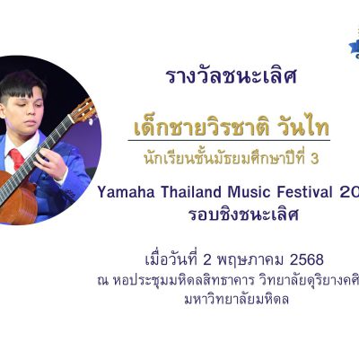 ขอชื่นชมและแสดงความยินดีกับ เด็กชายวิรชาติ วันไท ชั้นมัธยมศึกษาปีที่ 3/11 ได้รับรางวัล ชนะเชิศ ในการประกวด Yamaha Thailand Music Festival 2025 ประเภท Classical Guitar Solo รุ่นอายุไม่เกิน 14 ปี เมื่อวันที่ 2 พฤษภาคม พ.ศ. 2568 ณ หอประชุมมหิดลสิทธาคาร มหาวิทยาลัยมหิดล ศาลายา จังหวัดนครปฐม