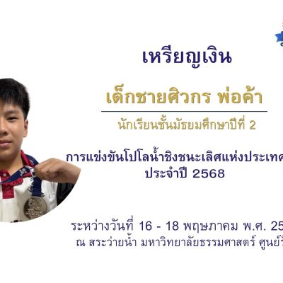 ขอชื่นชมและแสดงความยินดีกับ เด็กชายศิวกร พ่อค้า ชั้นมัธยมศึกษาปีที่ 2/13 ได้รับเหรียญเงินในการแข่งขันโปโลน้ำชิงชนะเลิศแห่งประเทศไทย ประจำปี 2568 ระหว่างวันที่ 16-18 พฤษภาคม 2568 รุ่นอายุ 18 ปี ชาย ณ สระว่ายน้ำ มหาวิทยาลัยธรรมศาสตร์ ศูนย์รังสิต