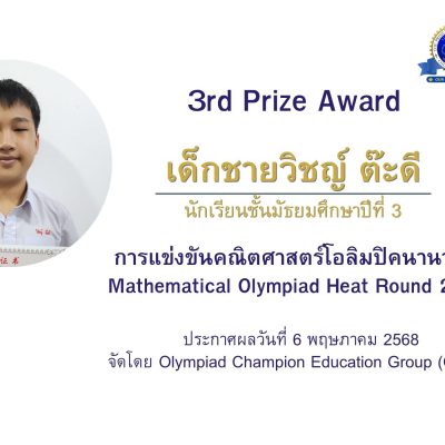 ขอชื่นชมและแสดงความยินดีกับ เด็กชายวิชญ์ ต๊ะดี ชั้นมัธยมศึกษาปีที่ 3/2 ได้รับรางวัล 3rd Prize Award การแข่งขันคณิตศาสตร์โอลิมปิกนานาชาติ รายการ Mathematical Olympiad Heat Round 2025 ณ Guangdong – Homg Kong – Macao Greater Bay Area (Big Bay Bei) Online เมื่อวันที่ 21 ธันวาคม 2567 และประกาศผลวันที่ 6 พฤษภาคม 2568 จัดโดย Olympiad Champion Education Group (OCEC)