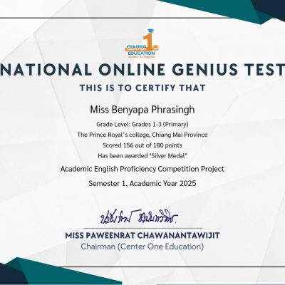 ได้รับรางวัล เหรียญเงินจากการแข่งขัน NATIONAL ONLINE GENIUS TEST โครงการทดสอบแข่งขัน วัดอัจฉริยภาพทางวิชาการ วิชาภาษาอังกฤษ ระดับประถมศึกษาตอนต้น 2568 (ระดับ ประเทศ)
