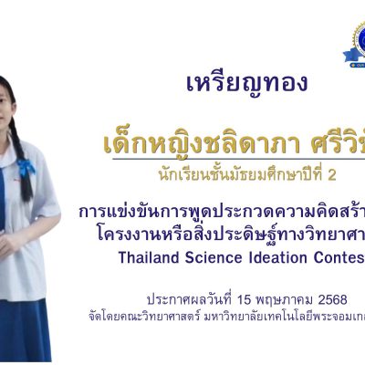 ขอชื่นชมและแสดงความยินดีกับ เด็กหญิงชลิดาภา ศรีวิชัย ชั้นมัธยมศึกษาปีที่ 2/5 ได้รับรางวัลเหรียญทอง ระดับ Gold Medalist among Grade 7-9 students (English version) on the first round, TSIC 2025 จากการแข่งขันการพูดประกวดความคิดสร้างสรรค์โครงงาน หรือสิ่งประดิษฐ์ทางวิทยาศาสตร์ Thailand Science Ideation Contest จัดโดย คณะวิทยาศาสตร์ มหาวิทยาลัยเทคโนโลยีพระจอมเกล้าธนบุรี ณ คณะวิทยาศาสตร์ มหาวิทยาลัยเทคโนโลยีพระจอมเกล้าธนบุรี เมื่อวันที่ 7 เมษายน 2568 และประกาศผล วันที่ 15 พฤษภาคม 2568