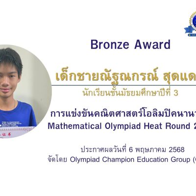 ขอชื่นชมและแสดงความยินดีกับ เด็กชายณัฐณกรณ์ สุดแดน ชั้นมัธยมศึกษาปีที่ 3/2 ได้รับรางวัล Bronz Award การแข่งขันคณิตศาสตร์โอลิมปิกนานาชาติ รายการ Mathematical Olympiad Heat Round 2025 ณ Guangdong – Homg Kong – Macao Greater Bay Area (Big Bay Bei) Online เมื่อวันที่ 21 ธันวาคม 2567 และประกาศผลวันที่ 6 พฤษภาคม 2568 จัดโดย Olympiad Champion Education Group (OCEC)