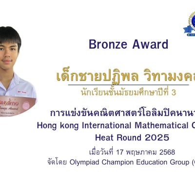 ขอชื่นชมและแสดงความยินดีกับ เด็กชายปฏิพล วิทามงคล ชั้นมัธยมศึกษาปีที่ 3/2 ได้รับรางวัล Bronze Award จากการแข่งขันคณิตศาสตร์โอลิมปิกนานาชาติ HKIMO (Hong kong International Mathematical Olympian Heat Round 2025) ดำเนินการโดย Olympiad Champion Education center(OCEC) ประเทศฮ่องกง ซึ่งได้รับการรับรองจากกระทรวงศึกษาธิการฮ่องกง ทำการทดสอบเมื่อวันที่ 17 พฤษภาคม พ.ศ.2568 ณ สนามสอบอาคารศิริพาณิชย์ จังหวัดเชียงใหม่