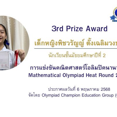 ขอชื่นชมและแสดงความยินดีกับ เด็กหญิงพิชวรัญญ์ ตั้งเฉลิมวงษ์ ชั้นมัธยมศึกษาปีที่ 2/1 ได้รับรางวัล 3rd Prize Award การแข่งขันคณิตศาสตร์โอลิมปิกนานาชาติ รายการ Mathematical Olympiad Heat Round 2025 ณ Guangdong – Homg Kong – Macao Greater Bay Area (Big Bay Bei) Online เมื่อวันที่ 21 ธันวาคม 2567 และประกาศผลวันที่ 6 พฤษภาคม 2568 จัดโดย Olympiad Champion Education Group (OCEC)