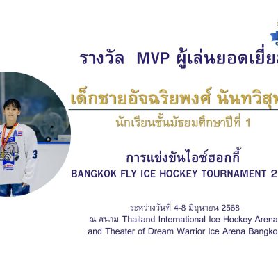 ขอชื่นชมและแสดงความยินดีกับ เด็กชายอัจฉริยพงศ์ นันทวิสุทธิ์ ชั้นมัธยมศึกษาปีที่ 1/10 ได้รับรางวัล MVP ผู้เล่นยอดเยี่ยม รุ่น U14 (division B) รายการแข่งขันไอซ์ฮอกกี้นานาชาติ BANGKOK FLY ICE HOCKEY TOURNAMENT 2025 รุ่น U12 Division ระหว่างวันที่ 4-8 มิถุนายน 2568 (ในนามของสมาคมเชียงใหม่ ไอซ์ฮอกกี้ ICE HOCKEY ASSOCIATION OF CHIANGMAI) ณ สนาม Thailand International Ice Hockey Arena and Theater of Dream Warrior Ice Arena Bangkok