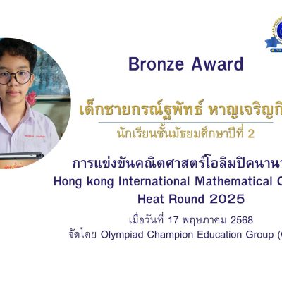 ขอชื่นชมและแสดงความยินดีกับ เด็กชายกรณ์ฐพัทธ์ หาญเจริญกิจ ชั้นมัธยมศึกษาปีที่ 2/5 ได้รับรางวัล Bronze Award จากการแข่งขันคณิตศาสตร์โอลิมปิกนานาชาติ HKIMO (Hong kong International Mathematical Olympian Heat Round 2025) ดำเนินการโดย Olympiad Champion Education center(OCEC) ประเทศฮ่องกง ซึ่งได้รับการรับรองจากกระทรวงศึกษาธิการฮ่องกง ทำการทดสอบเมื่อวันที่ 17 พฤษภาคม พ.ศ.2568 ณ สนามสอบอาคารศิริพาณิชย์ จังหวัดเชียงใหม่