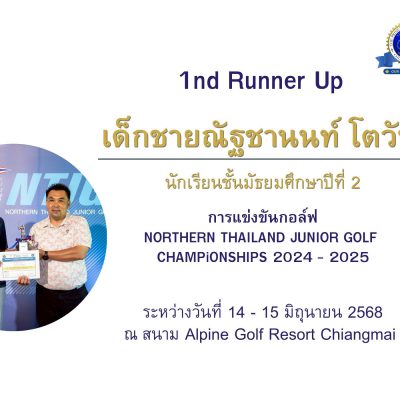 ขอชื่นชมและแสดงความยินดีกับ เด็กชายณัฐชานนท์ โตวัน ชั้นมัธยมศึกษาปีที่ 2/2 ได้รับรางวัล 1st Runner Up : Class BOY-B, Division II การแข่งขันกอล์ฟ รายการ NORTHERN THAILAND JUNIOR GOLF CHAMPiONSHIPS 2024-2025 ระหว่างวันที่ 14-15 มิถุนายน 2568 ณ สนาม Alpine Golf Resort Chiangmai จัดโดย Northern Thailand Junior Golf Club (NTJGC)
