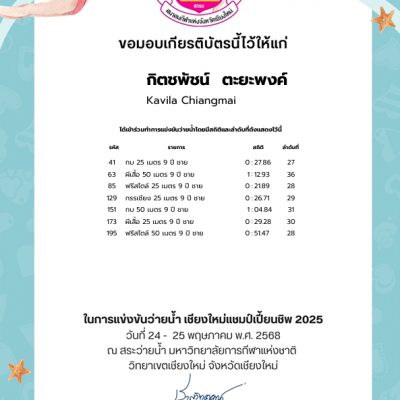 จากการแข่งขันว่ายน้ำ เชียงใหม่แชมป์เปี้ยนชิพ 2025 เมื่อวันที่ 24-25 พฤษภาคม 2568