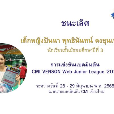 ขอชื่นชมและแสดงความยินดีกับ เด็กหญิงปันนา พุทธินันทน์ คงขุนเทียน นักเรียนชั้นมัธยมศึกษาปีที่ 3/4 ได้รับรางวัล ชนะเลิศ ประเภท คู่ผสมอายุไม่เกิน 14 ปี ในการแข่งขันแบดมินตัน CMI VENSON Web Junior League 2025 วันที่ 28-29 มิถุนายน 2568 ณ สนามแบดมินตัน CMI เชียงใหม่