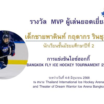 ขอชื่นชมและแสดงความยินดีกับ เด็กชายพาคินท์ กฤดากร รินชุมภู ชั้นมัธยมศึกษาปีที่ 2/4 ได้รับรางวัล MVP ผู้เล่นยอดเยี่ยม รุ่น U14 (division B) รายการแข่งขันไอซ์ฮอกกี้นานาชาติ BANGKOK FLY ICE HOCKEY TOURNAMENT 2025 รุ่น U12 Division ระหว่างวันที่ 4-8 มิถุนายน 2568 (ในนามของสมาคมเชียงใหม่ ไอซ์ฮอกกี้ ICE HOCKEY ASSOCIATION OF CHIANGMAI) ณ สนาม Thailand International Ice Hockey Arena and Theater of Dream Warrior Ice Arena Bangkok