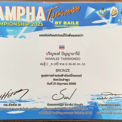 ได้รับรางวัล เหรียญ Bronze จากการเข้าร่วมแข่งขันเทควันโด ประเภทต่อสู้ Class C รุ่นอายุ 9-10 ปีชาย G 36-40  กิโลกรัม G1