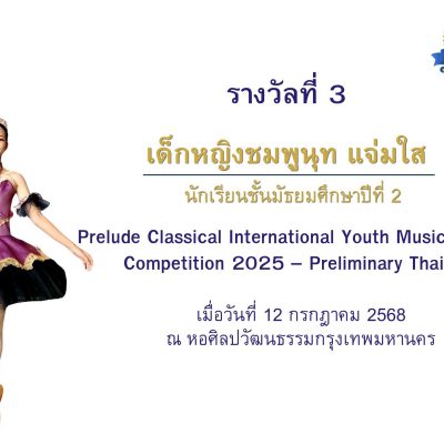 ขอชื่นชมและแสดงความยินดีกับ เด็กหญิงชมพูนุท แจ่มใส ชั้นมัธยมศึกษาปีที่ 2/8 ได้รับรางวัลที่ 3 Merit (70-79 คะแนน) เต้นคู่ รุ่น Duo D ในรายการ Prelude Classical International Youth Music & Dance Competition 2025 – Preliminary Thailand เมื่อวันที่ 12 กรกฎาคม 2568 จัดโดย Tune of Passion Festival, INTERNATIONAL CO-MUSIC