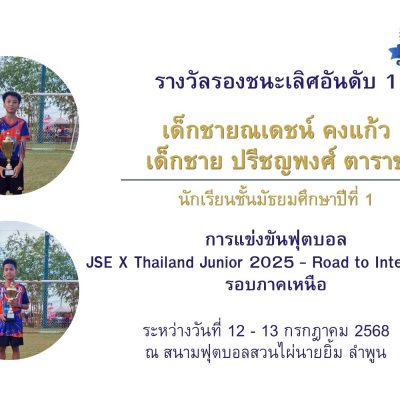ขอชื่นชมและแสดงความยินดีกับ เด็กชายณเดชน์ คงแก้ว และเด็กชายปรีชญพงศ์ ตาราช ชั้นมัธยมศึกษาปีที่ 1 ได้รับรางวัลรองชนะเลิศอันดับ 1 ในการแข่งขันฟุตบอล JSE X Thailand Junior 2025 – Road to International รอบภาคเหนือ ระหว่างวันที่ 12 – 13 กรกฎาคม 2568 ณ สนามฟุตบอลสวนไผ่นายยิ้ม ลำพูน จัดโดย JSE THAILAND
