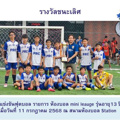 ขอชื่นชมและแสดงความยินดีกับ นักกีฬาฟุตบอลทีม PRC รางวัลชนะเลิศอันดับที่ 1 การแข่งขันฟุตบอล รายการห้องบอล Mini leauge รุ่น13 ปี เมื่อวันที่ 11 กรกฎาคม 2568 ณ สนามห้องบอล Station โดยมีสมาชิกในทีม