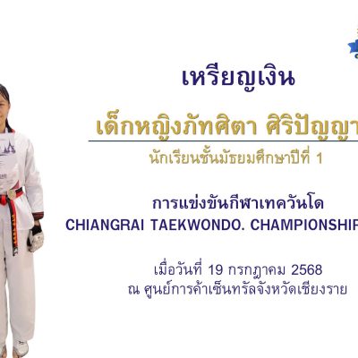 ขอชื่นชมและแสดงความยินดีกับ เด็กหญิงภัทศิตา ศิริปัญญา ชั้นมัธยมศึกษาปีที่ 1/9 ได้รับรางวัลรองชนะเลิศอันดับ 1 (เหรียญเงิน) รายการ CHIANGRAI TAEKWONDO CHAMPIONSHIP 2025 รุ่นอายุ13-14ปี หญิง เกราะไฟฟ้าคลาส A น้ำหนัก 47-51kg เมื่อวันที่19 กรกฎาคม 2568 ณ ศูนย์การค้าเซ็นทรัลจังหวัดเชียงรายจัดโดย สมาคมกีฬาแห่งประเทศไทย จังหวัดเชียงราย