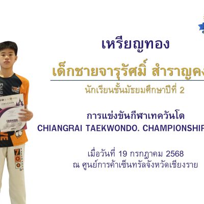 ขอชื่นชมและแสดงความยินดีกับ เด็กชายจารุรัศมิ์ สำราญคง ชั้นมัธยมศึกษาปีที่ 2/12 ได้รับ เหรียญทอง ประเภทต่อสู้ชาย อายุ 13-14 ปี รุ่นน้ำหนัก 55-59 กิโลกรัม รายการ CHIANGRAI TAEKWONDO CHAMPIONSHIP 2025 เมื่อวันที่19 กรกฎาคม 2568 ณ ศูนย์การค้าเซ็นทรัลจังหวัดเชียงรายจัดโดย สมาคมกีฬาแห่งประเทศไทย จังหวัดเชียงราย