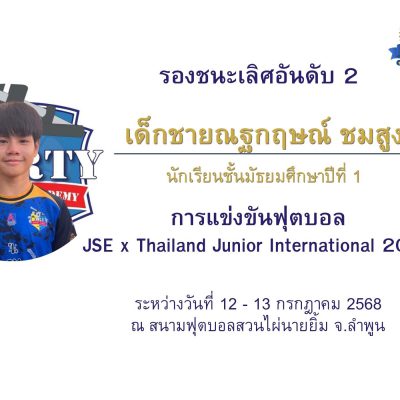 ขอชื่นชมและแสดงความยินดีกับ เด็กชายณฐกฤษณ์ ชมสูง ชั้นมัธยมศึกษาปีที่ 1/10 ได้รับรางวัลรองชนะเลิศอันดับ 2 ในการแข่งขันฟุตบอล JSE X Thailand Junior 2025 – Road to International รอบภาคเหนือ ระหว่างวันที่ 12 – 13 กรกฎาคม 2568 ณ สนามฟุตบอลสวนไผ่นายยิ้ม ลำพูน จัดโดย JSE THAILAND