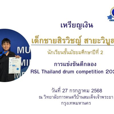ขอชื่นชมและร่วมแสดงความยินดีกับ เด็กชายสิรวิชญ์ สายะวิบูลย์ ชั้นมัธยมศึกษาปีที่ 2/1 ได้รับรางวัลเหรียญเงิน พร้อมเกียรติบัตร ในการแข่งขันตีกลอง RSL Thailand drum competition 2025 ระดับ Intermediate ณ วิทยาลัยการดนตรีบ้านสมเด็จเจ้าพระยา กรุงเทพมหานคร เมื่อวันที่ 27 กรกฎาคม 2568 จัดการแข่งขันโดย Rockschool Thailand