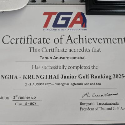 ขอชื่นชมและร่วมแสดงความยินดีกับ เด็กชายธนัน อนุสรณ์สมชาย ชั้นประถมศึกษาปีที่ 2/1 ได้รับรางวัล 1 runner up Class E-BOY จากการแข่งขัน SINGA-KRUNGTAI Junior Golf Ranking 2025-2026 จัดโดย สมาคมTGA Thailand Golf Association. ณ Chiangmai Highlands Golf and spa ระหว่างวันที่ 2- 3 สิงหาคม 2568