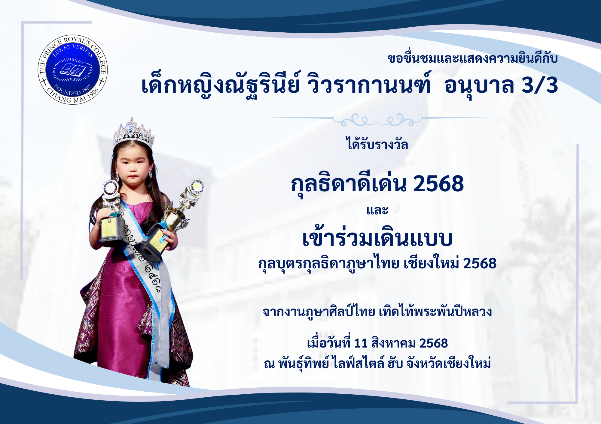 ขอชื่นชมและแสดงความยินดีกับ เด็กหญิงณัฐรินีย์ วิวรากานนฑ์ ชั้นอนุบาล 3/3