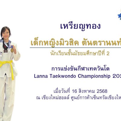 เด็กหญิงมิวสิค ตันตรานนท์ ได้รับรางวัลชนะเลิศเหรียญทอง การแข่งขันชิงแชมป์ภาคเหนือ 2568 Lanna Taekwondo Championship 2025 ประเภทต่อสู้ Kyorugi รุ่นอายุ 13-14 ปี หญิง น้ำหนัก 43-47 กก. เมื่อวันที่ 16 สิงหาคม 2568 ณ เชียงใหม่ฮอลล์ ศูนย์การค้าเซ็นทรัล เชียงใหม่ แอร์พอร์ต จัดโดย การกีฬาแห่งประเทศไทย จังหวัดเชียงใหม่ ร่วมกับสมาคมกีฬาแห่งจังหวัดเชียงใหม่
